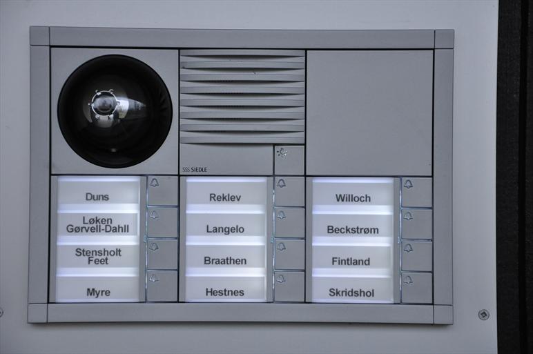 Siedle porttelefoner med video og kodeoppkall (oppkall via kode). Tablået har også lampemodul samt informasjonsmodul for navn.